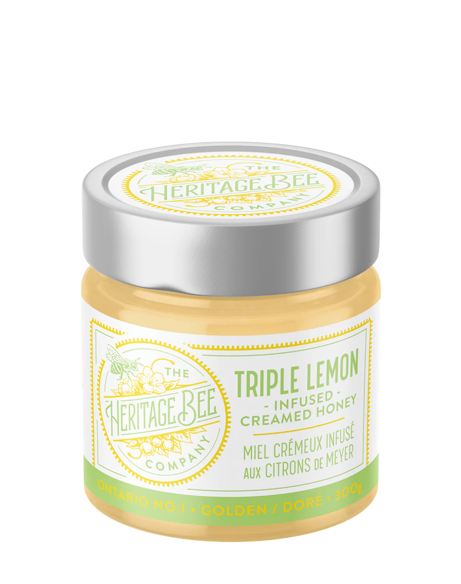 Infused into every jar of our Triple Lemon Creamed honey is premium lemon oil, freshly squeezed Organic Meyer Lemon juice, plus Organic Meyer Lemon rind prepared by hand at the Heritage Bee Co. The triple lemon combination is blended into our 100% Ontario wildflower creamed honey for an extraordinary treat. Our honey is hand extracted, hand bottled, and hand labelled just north of Toronto, Ontario Canada.