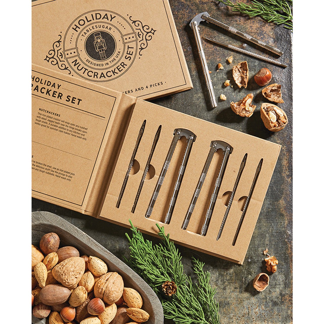 Size: Box - 6" W x 7.5" H x 0.75" D / Nutcracker - 5" L / Picks - 5" L