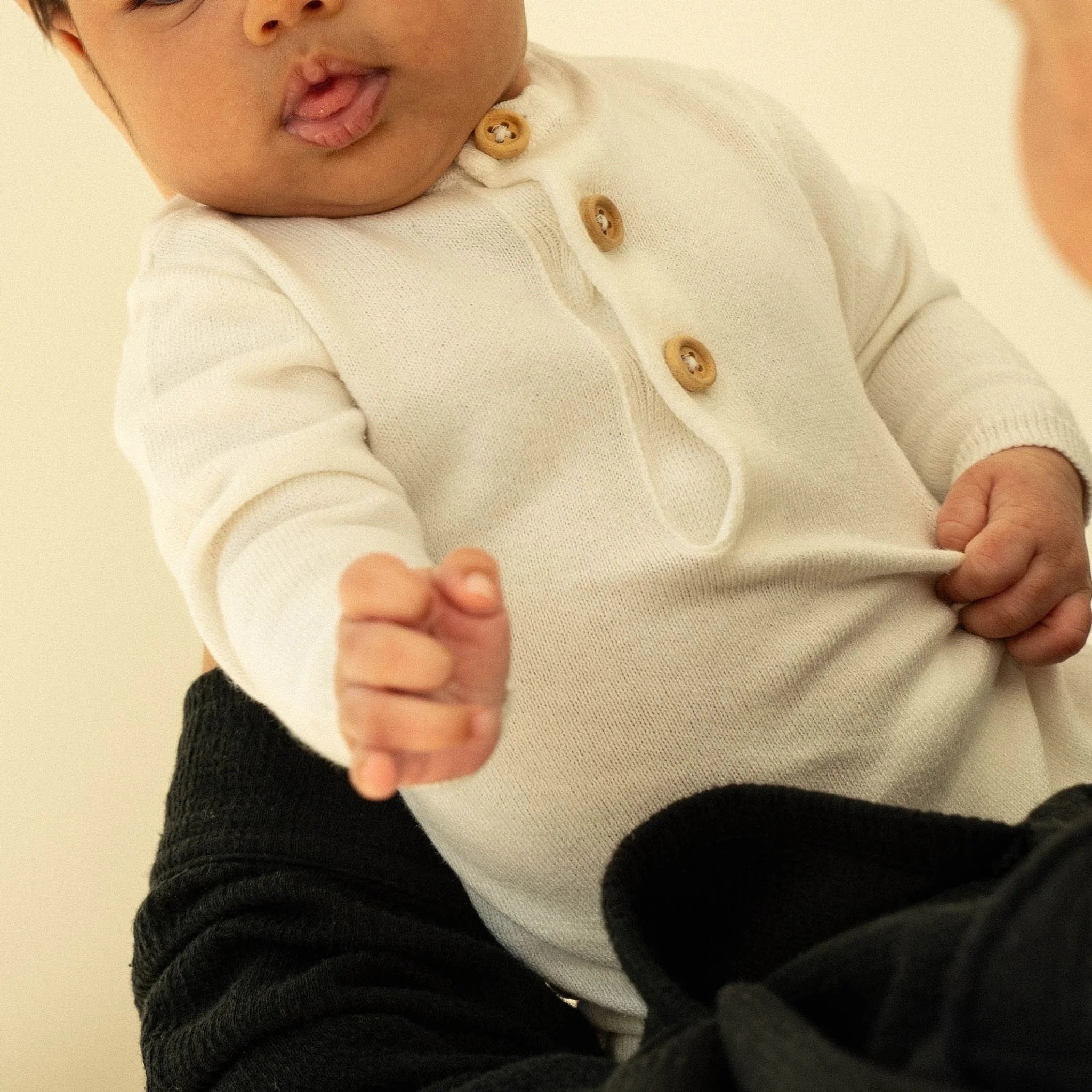 Get your little one ready for their closeup with the Riley Jumpsuit. This cozy onesie features long sleeves, a classic finished neckline, and a soft cotton knit texture, ensuring both comfort and cuteness. The wooden buttons complete the adorable look and make dressing a breeze. Machine Wash Gentle.