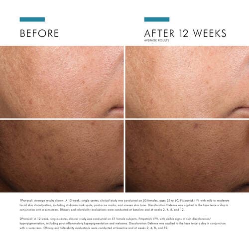 Discoloration Defense is a layerable, daily-use dark spot corrector clinically proven to reduce the appearance of key types of skin discoloration in all skin tones, including hard-to-treat forms such as stubborn brown patches and post-acne marks. This latest-generation formula improves the appearance of skin discoloration, brightens skin, and evens skin tone in as early as 2 weeks.