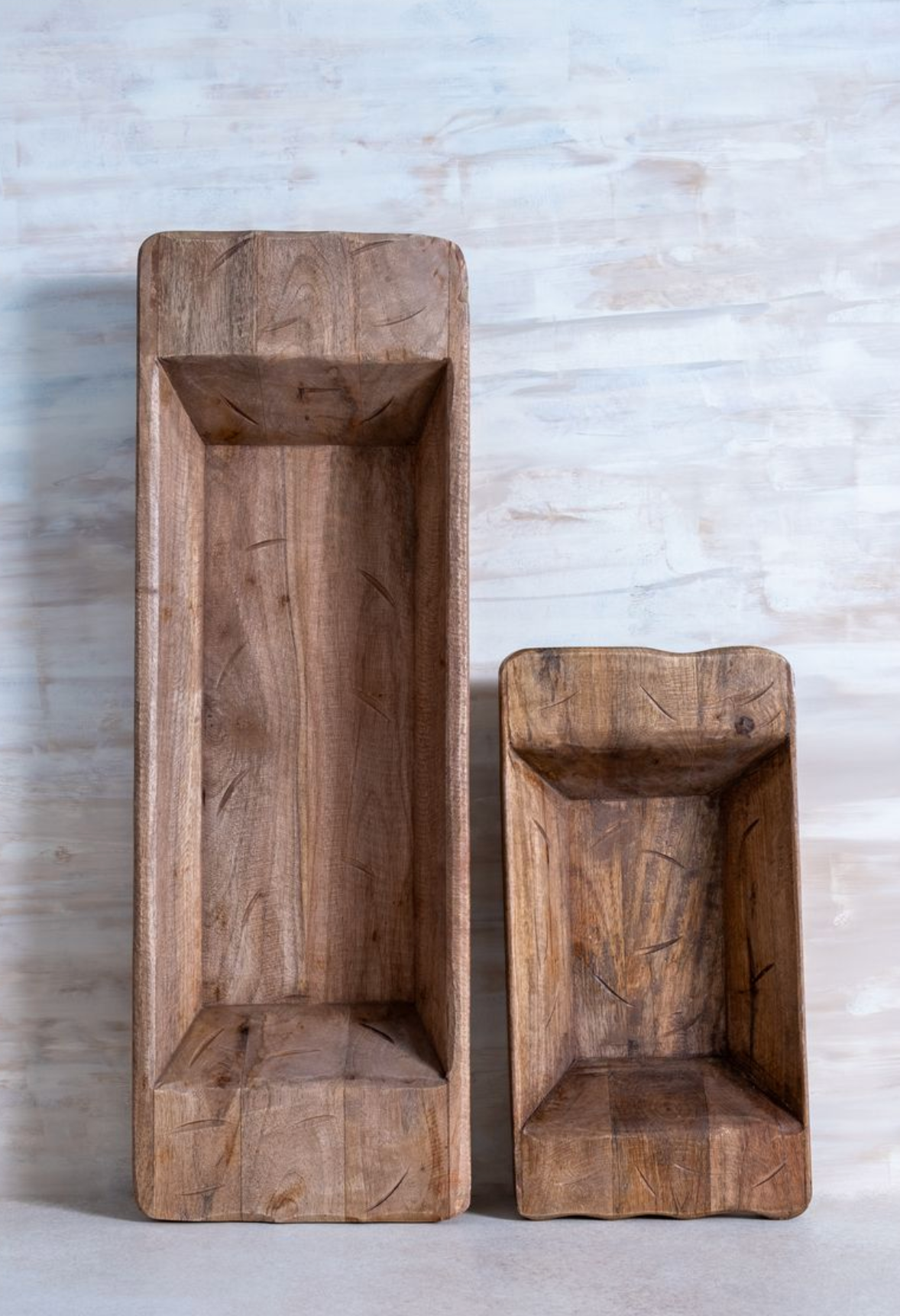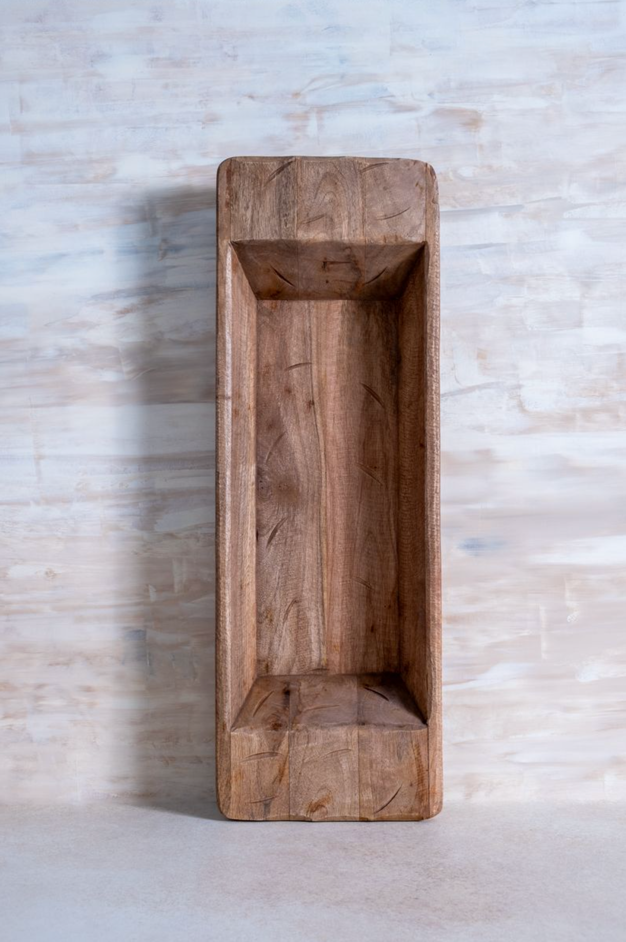Hand-carved from thick natural wood, this elongated dough bowl showcases artisan craftsmanship with unique grain patterns and sturdy handles. Food-safe and versatile, it works beautifully for displaying fruit, candles, or bath essentials across cottage, farmhouse, and vintage interiors. Each piece is one-of-a-kind with natural variations in shape and colour.
