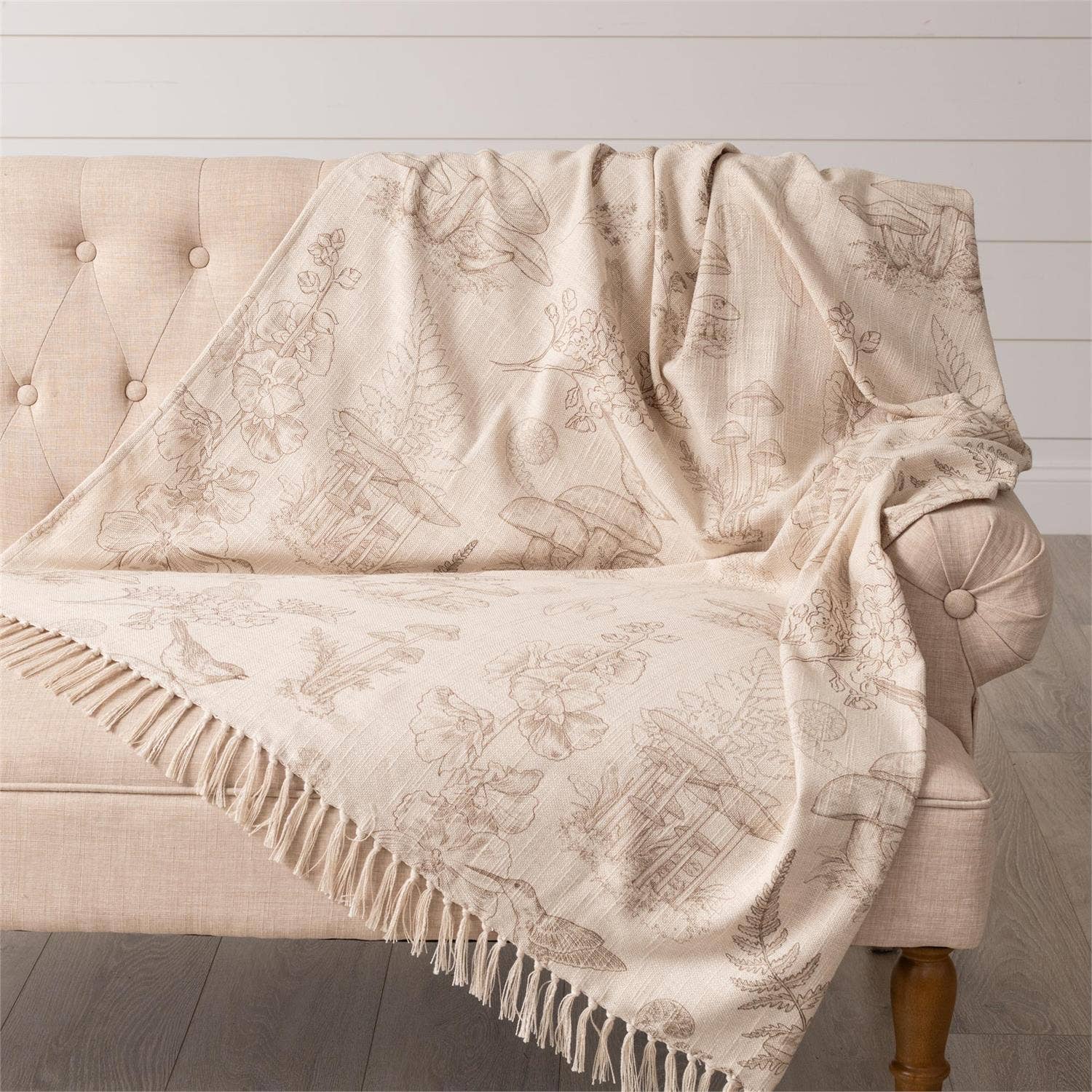 Experience warmth and comfort with our Hummingbird and Mushrooms throw blanket. Measuring 50" W x 60" L, this cotton throw is perfect for relaxing on the couch or adding an extra layer of warmth to your bed.